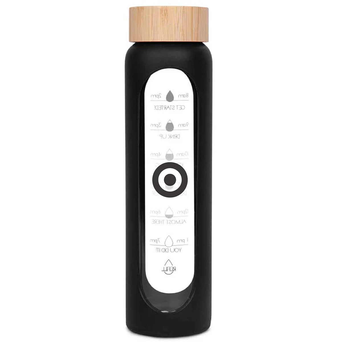A borosilicate glass tumbler designed to keep drinks cold for up to 24 hours and hot for up to 12 hours. Covered in soft silicone with pre-printed hourly hydration reminders, it features a wide-mouth bamboo screw-on lid with a seal and a removable inner metal filter.