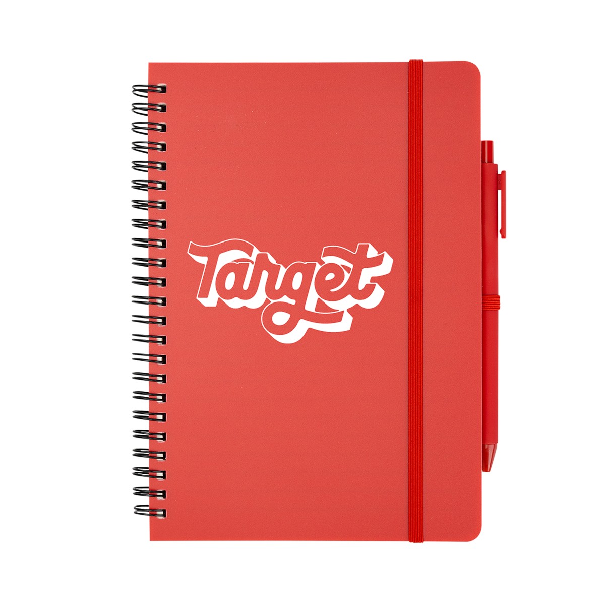 Durable and eco-friendly, this spiral notebook features a matching strap closure and elastic pen loop with a coordinating plunger-action pen. Lined pages provide a smooth writing experience, making it ideal for notes, lists, or creative ideas.